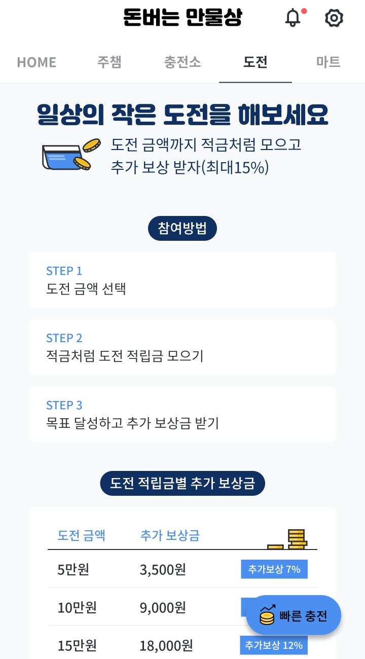 4. 도전 - 도전 금액을 선택 후 적립금을 달성하염 도전 금액 + 추가 보상금을 줍니다.