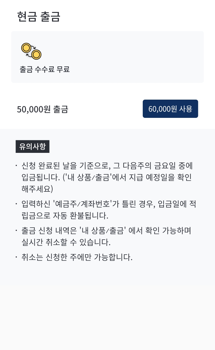 최초 출금 시 1000원의 수수료만 내고 1:1 비율로 가능하여, 5만원 현금으로 출금하였습니다.