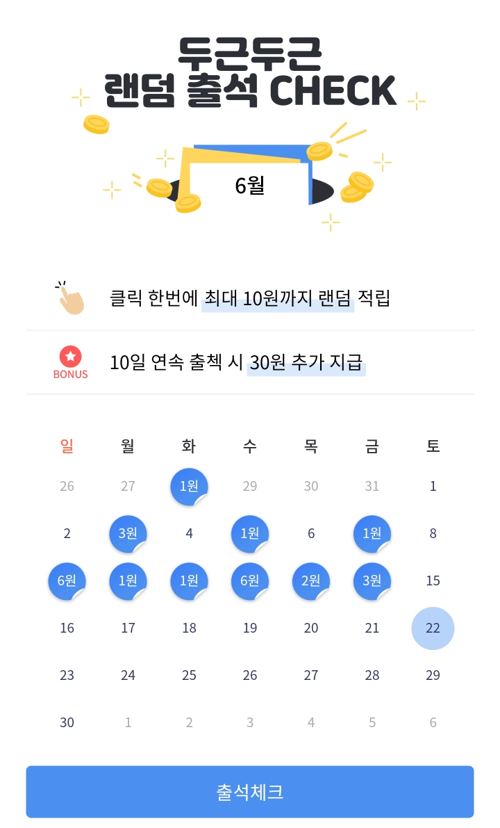 1. 출석 체크 - 1회 당 최대 10원 이내. 10일 연속 출첵 시 30원 추가 지급( 매 클릭마다 광고를 봐야 합니다.)