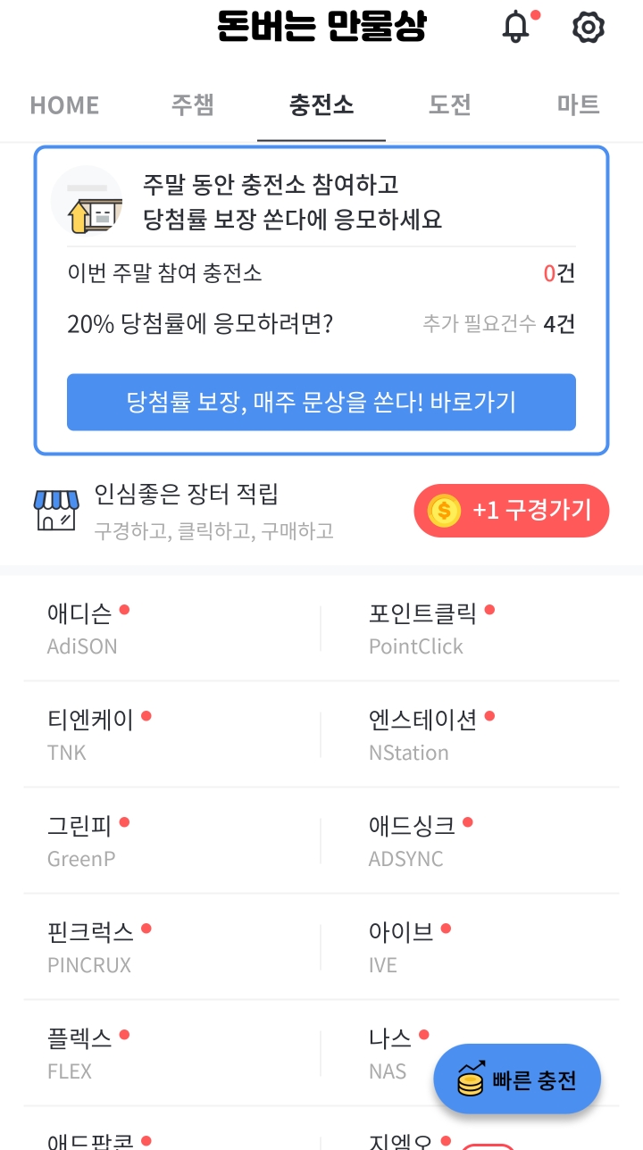 3. 충전소를 통한 적립 - NAS, GMO(지엠오) 등 다양한 애드와 연계되어 적립을 할 수 있습니다. 각 충전소 페이지마다 적립금이 다르므로 비교 후 가장 높은 적립금을 받을 수 있는 미션, 다운로드 등을 하시는 걸 추천드립니다.