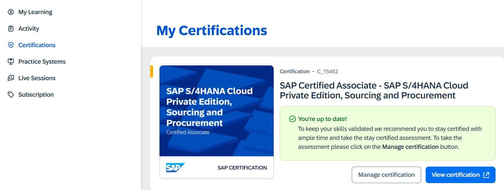 이전엔 영구 혹은 5~10년 정도의 유효성이 있었으나 지금은 SAP 러닝 허브를 구독해서 Stay Certi로 1년 연장을 꾸준히 해야 자격증을 유지할 수 있게 되었습니다