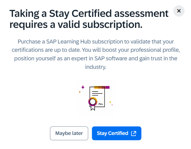 해당 팝업에서 Stay Certified 를 누르면 SAP Learning Hub 로 이동합니다.