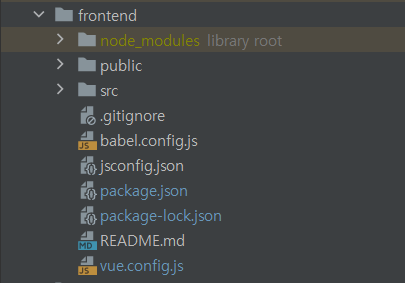 프로젝트 폴더 밑에 설정한 Vue 폴더가 보이고 기본적인 구조가 자동으로 구성이 됨.