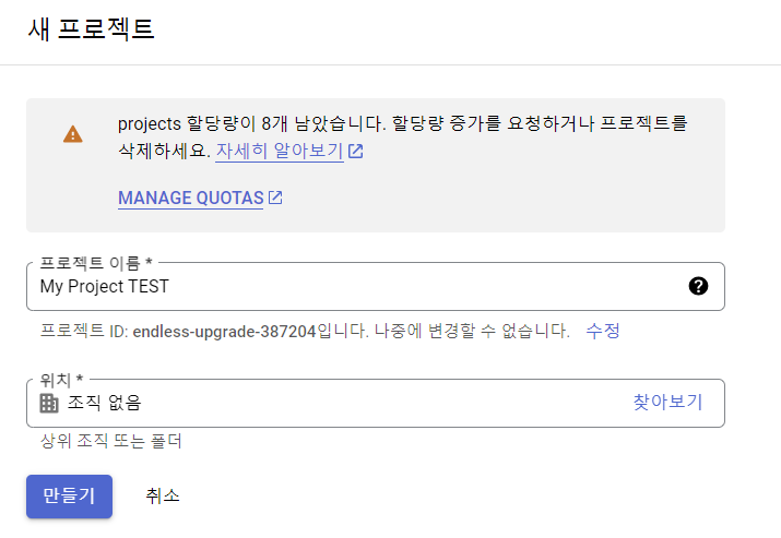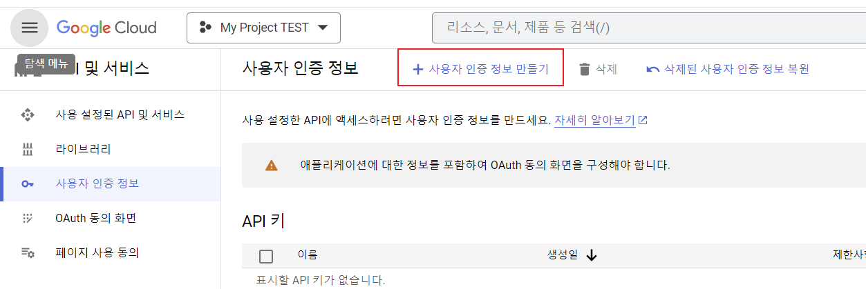 사용자 API 설정에서 새 프로젝트 생성하기